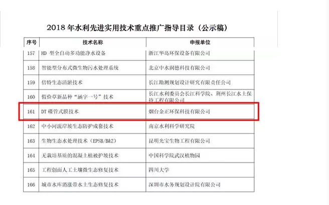 金正環保DT碟管式膜技術入圍《2018年水利先進實用技術重點