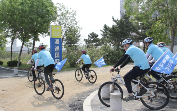 8:30分,騎行隊伍身著印有公司Logo的統(tǒng)一著裝,每輛自行車上掛著寫有“低碳環(huán)保,金正齊行”的旗幟,開始騎行至養(yǎng)馬島,全程10公里。