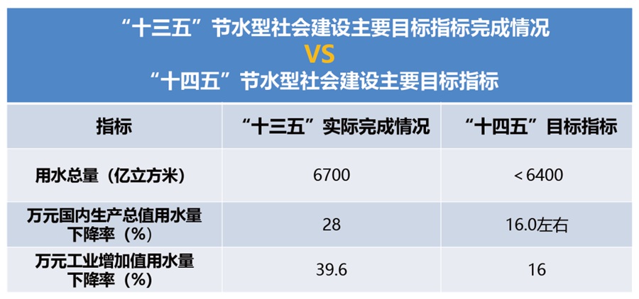 節水型社會從2000年開始探索建立至今已經20年,取得了顯著成效。從“十三五”實際完成情況和“十四五”目標指標對比表顯示,2025年用水總量目標指標比2020年實際完成情況減少300億立方米。其中,國內生產總值用水量下降率減少12%,工業增加值用水量下降率減少23.6%,我國用水結構不斷優化,用水效率進一步提升。