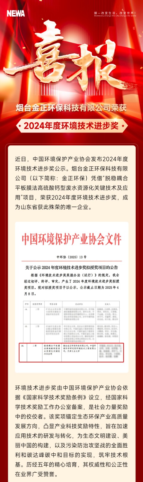 喜報(bào)|煙臺(tái)金正環(huán)保榮獲2024年度環(huán)境技術(shù)進(jìn)步獎(jiǎng)